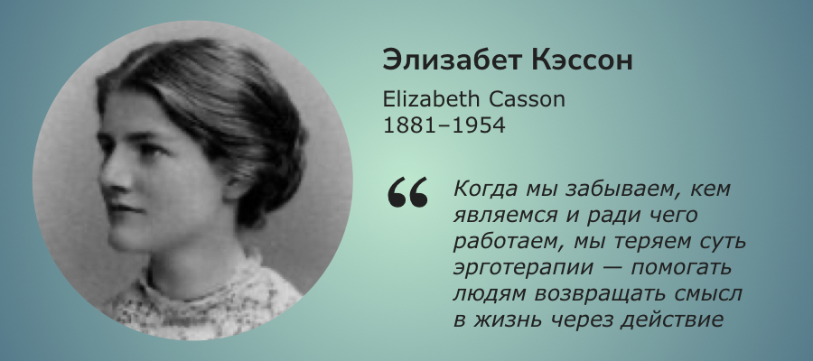 Элизабет Кэссон — британский врач и одна из первых женщин-медиков в Великобритании. Кэссон увидела, как важны творческая и осмысленная деятельность для пациентов психиатрических больниц, и в 1930 году основала первую школу эрготерапии в Европе — Dorset House School of Occupational Therapy. Ее идеи легли в основу британской модели подготовки специалистов и помогли признать эрготерапию официальной медицинской профессией.