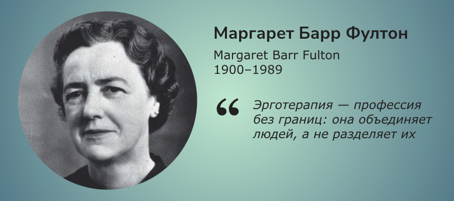 Маргарет Барр Фултон — первый квалифицированный эрготерапевт Великобритании и одна из создательниц Всемирной федерации эрготерапии (WFOT). Фултон активно развивала систему профессионального образования, занималась организацией курсов и программ подготовки специалистов. Благодаря ее усилиям, в 1952 году была создана WFOT — структура, которая и сегодня объединяет специалистов из более чем 100 стран.