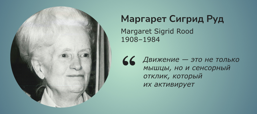 Маргарет Сигрид Руд — пионер нейрофизиологических подходов в эрготерапии. Руд предложила революционную для своего времени концепцию, основанную на сенсомоторной стимуляции. Она утверждала, что можно активировать двигательные функции через стимуляцию рецепторов — прикосновения, давление, холод, вибрацию. Ее подход, известный как Rood’s approach, стал одним из предшественников концепций Бобат и Войта, и повлиял на развитие нейрореабилитации.